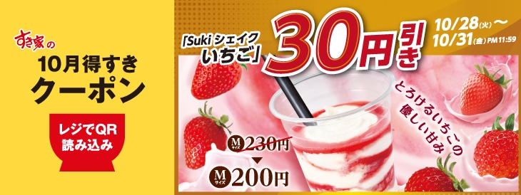 すき家「牛すき鍋定食」などが70円引きになる「10月得すきクーポン」第3弾を配信。「Sukiシェイク いちご」は30円引き