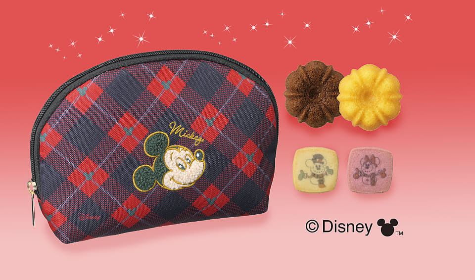 内容: もこもこしたさがら刺繍の「ミッキーマウス」がかわいいチェック柄ポーチと、花形のフルーリマドレーヌとクッキーのアソート。