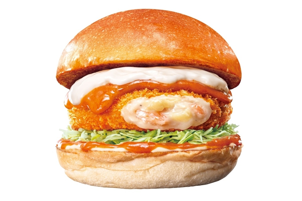 プリプリ食感のえびやマカロニがたっぷり入ったホワイトソースと、サクサク食感の衣が楽しめるえびグラタンコロッケに、えびの旨みと香ばしい風味がぎゅっと詰まったビスクソースを合わせ、4種類のチーズをブレンドしたとろ~りチーズソースや、キャベツなどとともにふんわりもっちり食感のバンズで挟んでいる。
