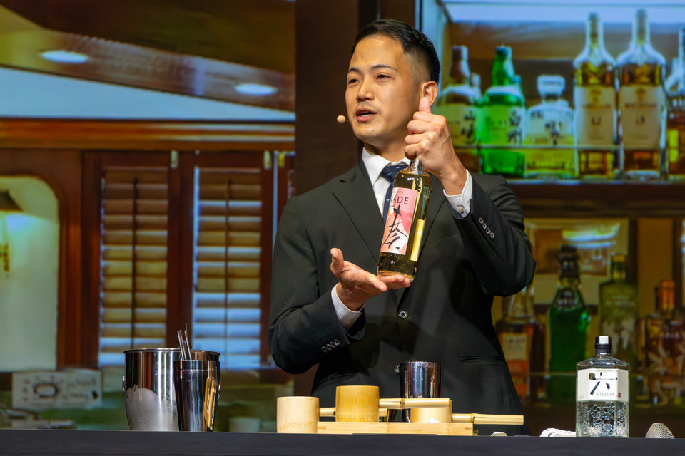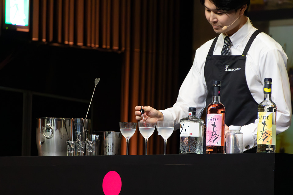 ファーストステージは「あなたが世界に伝えたい日本発のカクテル」 をテーマに、それぞれが創作したカクテルを持ち時間6分以内に完成させるという内容。そして、ただ作るだけでなく、用いた材料やレシピ、イメージした世界をストーリー性豊かにプレゼンテーションすることも求められた。また、同社のジン「ROKU〈六〉」、ウオツカ「HAKU〈白〉」、リキュール「KANÁDE〈奏〉」、ウイスキー「碧Ao」から1品以上を使うというルールが設定されていた。