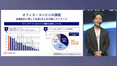 実際にオフィスとコンビニの関係性について、2024年にKDDI社員を対象にアンケートを採ったところ、オフィスに必要なサービスとして、50%以上がコンビニエンスストアを挙げた。出社時のコンビニエンスストアの利用頻度は91%が日常的に利用すると回答。一方、コンビニで感じるストレスは何かという問いに対しては、レジ待ちが多かったり、混雑する時間があるといった答えが多く、お昼時を過ぎると、商品がなくなっているなどの不満も挙げられていたという。
