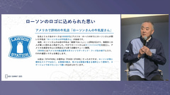トークセッションの冒頭、ローソンの酒井氏からローソンの青い看板に描かれたロゴについて、説明が行なわれた。ローソンのロゴに描かれたミルク缶のマークは、米オハイオ州のJ.J.ローソンが開いた牛乳店に由来するもので、かつてはミルク缶の下に「FOOD STORE」と書かれていたが、現在は「STATION」と書かれている。これはローソンが単に便利なコンビニエンスストアとしてだけでなく、地域に暮らすさまざまな人の拠点、集まっていただく場所(STATION)でありたいという願いを込めて、現在のロゴがデザインされているという。