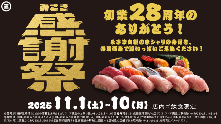 回転寿司みさき(京樽)は、11月に創業28周年を迎えることを記念して「みさき感謝祭」を11月1日~10日に実施する。