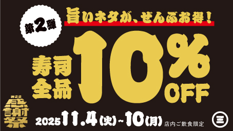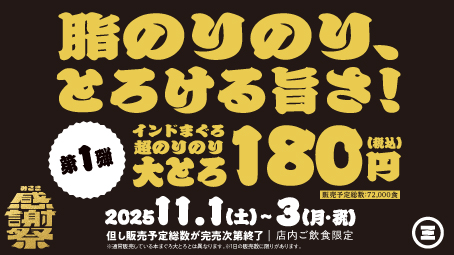 第1弾は11月1日~3日の間、脂のり抜群でとろける旨さが味わえる「インドまぐろ超のりのり大とろ」を180円で提供する。第2弾は11月4日~10日の間、寿司が全て10%オフとなる。