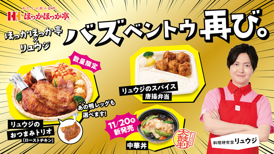 ほっかほっか亭は、人気料理研究家リュウジ氏とのコラボレーションの第2弾「バズベントウ 再び。」シリーズを11月6日に発売する。
