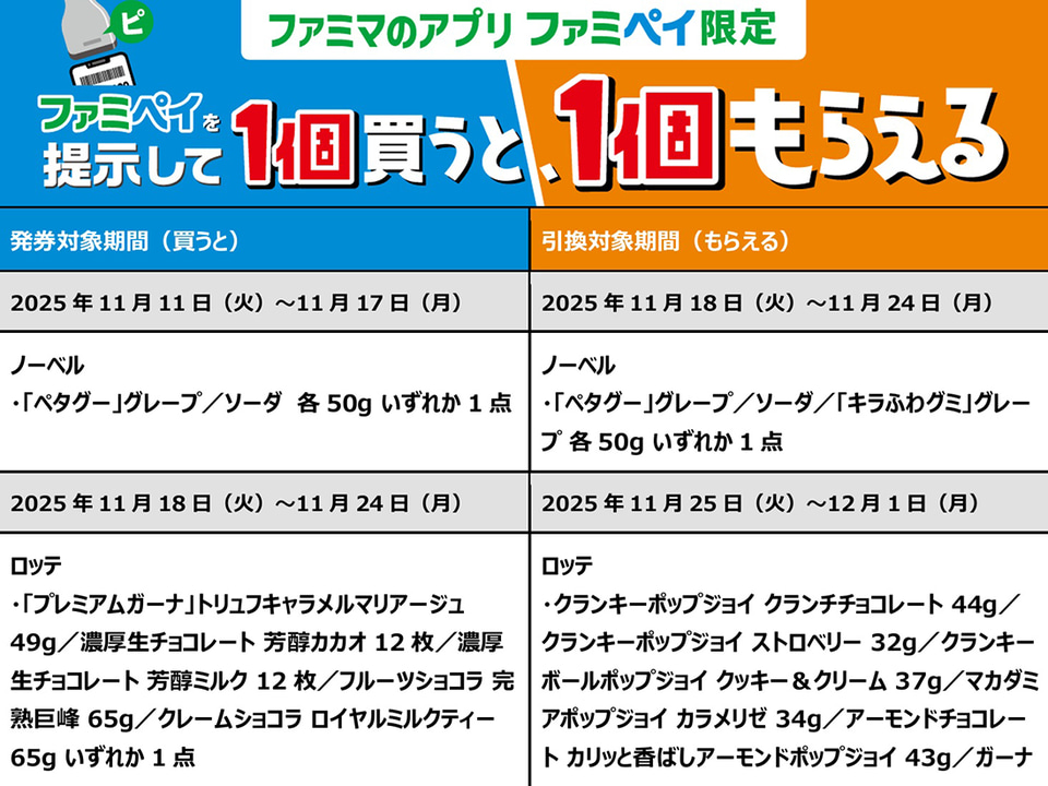 ニュースファミマ、アプリ「ファミペイ」で“1個購入でもう1個もらえる”お得な11月のクーポンを配信 野村シンヤ2025年11月6日 07:002025年11月4日から順次配信ファミリーマート「ファミペイ」でお得なクーポンを配信 ファミリーマートはアプリ「ファミペイ」利用者に対し、お得なクーポンを11月4日から配信している。 11月は「勤労感謝の日」をテーマに、ランチに最適な総菜やお弁当、ブレイクタイムに欠かせないお菓子や飲料などの引き換えクーポンや割引クーポンを配信している。一例としては、「爽健美茶」「綾鷹」の300mL商品を1点購入すると、後日同じものが1点もらえる「ファミペイ払いで1個買うと1個もらえる」クーポンを提供している。 ファミペイクーポン活用例