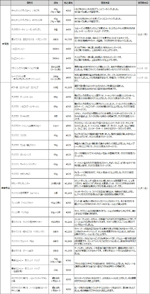 今年のクリスマス限定商品は、定番の「ヘクセンハウス」や「カウントダウンカレンダー」に加え、新商品の「キャンディングポップコーン」や「シャンメリー」、手づくりキット「フライパンでつくる魚介パエリアの素」など全30種で、昨年より豊富なラインナップを展開する。