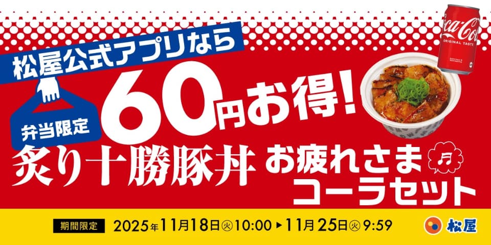 さらに、アプリ注文クーポンに「お疲れさまコーラセット」を11月18日10時~25日9時59分の1週間限定で用意する。「炙り十勝豚丼弁当各種」と「コカ・コーラ」をセットで購入すると60円引きになる。