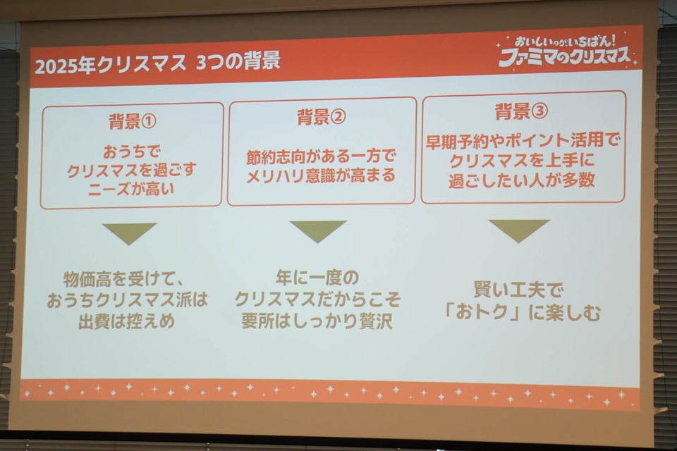 2025年のクリスマスについて「物価高の影響で節約を意識しながらも、特別な部分にはお金をかけ、早期予約などを活用して、メリハリ上手に楽しむ傾向になる。そこで、ファミマでは“メリハリ工夫で楽しむクリスマス”を打ち出したい」と述べた。