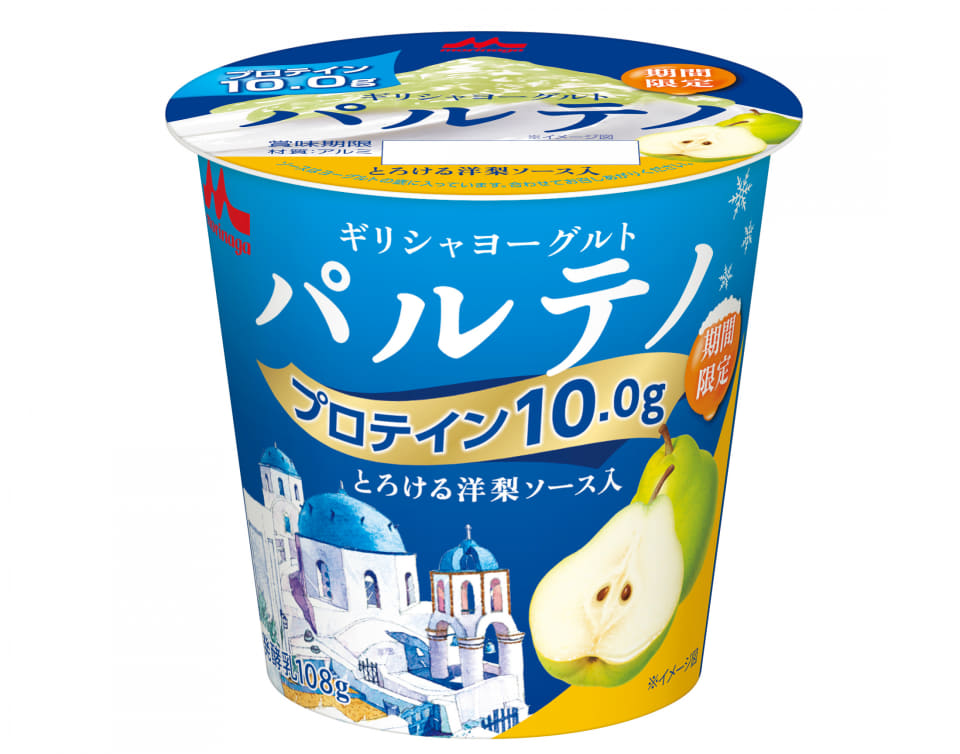 森永乳業、約1年4か月ぶりの季節限定フレーバー「ギリシャヨーグルト パルテノ とろける洋梨ソース入」発売