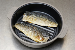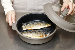 焼く: 1.食材を入れる、2.ふたをして電子レンジで加熱、3.食材をひっくり返す、4.裏面で再加熱