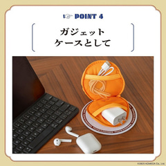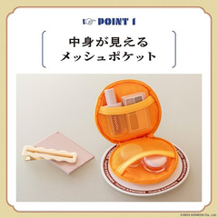 デニッシュ(?)の中が収納スペースになっていて、小物が仕分けしやすいメッシュポケットを2つ備えている。ボールチェーン付きでバッグにぶら下げていつでも一緒。お皿の部分(プレート)は外せるようになっていて、サイズはポーチが約10×9cm(直径最大×高さ)、プレートが約13.5cm(直径)。