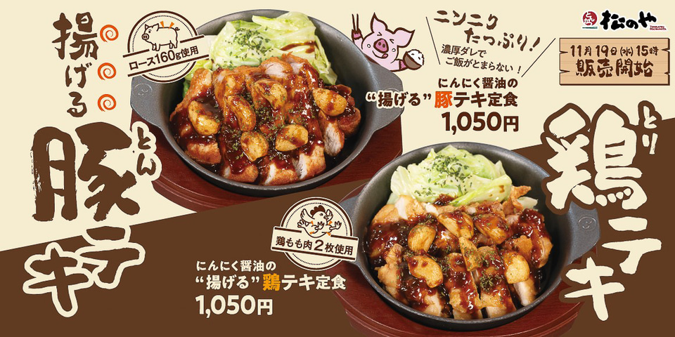 とんかつ専門店「松のや」(松屋フーズ)は「にんにく醤油の揚げる豚(とん)テキ定食」と「にんにく醤油の揚げる鶏(とり)テキ定食」を11月19日15時に発売する。