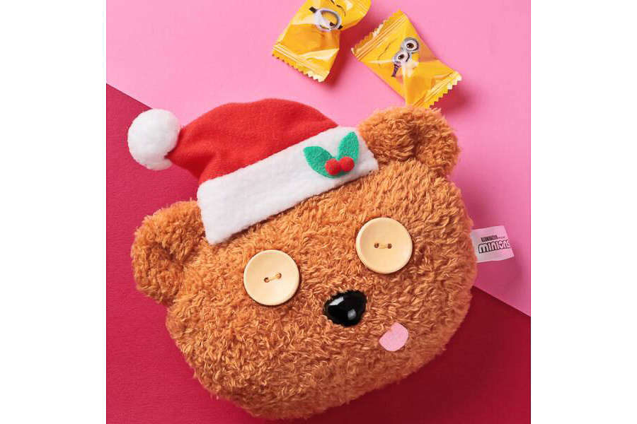 映画「ミニオンズ」シリーズに登場するキャラクター「ボブ」がいつも持っているクマのぬいぐるみ「ティム」に、クリスマスの帽子を着けたフェイスデザインのポーチ。サイズは約150×140×70mmで、中にキャンディ(6g)が入っている。