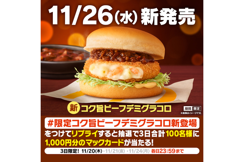 日本マクドナルドは、冬の定番「グラコロ」と新商品の「コク旨ビーフデミグラコロ」を11月26日に発売する。