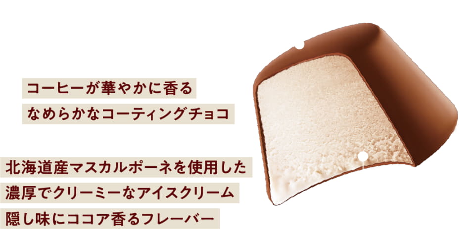 乳脂肪分9%の北海道産マスカルポーネチーズを使用したアイスクリームをコーヒーチョコでコーティングしており、ねっとり食感と濃厚なおいしさがあるという。隠し味には、ココアが香るフレーバーを加えることで、ティラミスの再現性を高めた。