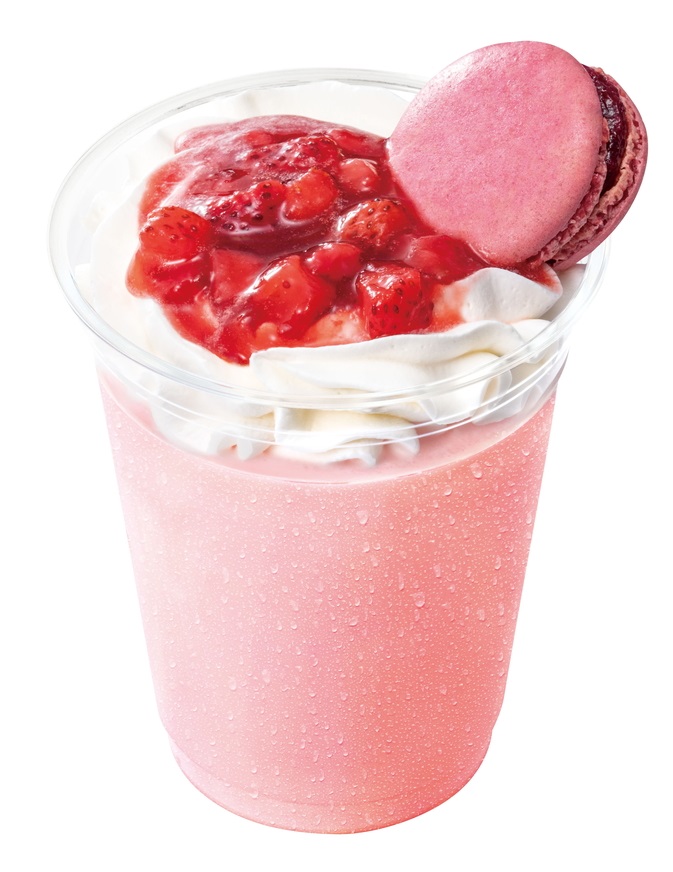あまおうの果汁入りシロップを使用したシェーキに、ホイップクリームや苺の果肉入りソース、ベリーマカロンをトッピングした。濃厚な甘みと酸味のバランスのよいあまおうならではの味わいで、パフェのようなシェーキに仕上げた。