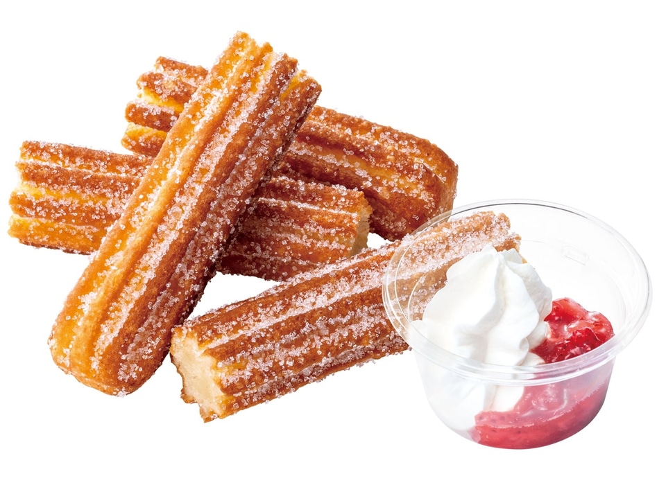 苺の果肉入りソースとホイップクリームにチュロをディップして楽しめるスイーツ。ごろっとした苺の果肉とサクッともちもち食感のチュロの組み合わせが楽しめる。