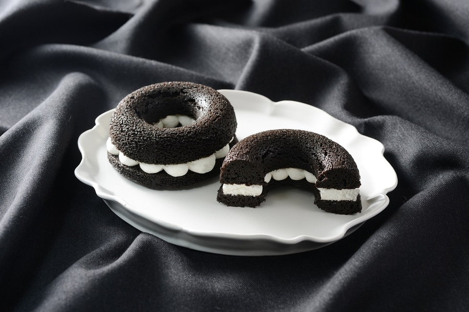 竹炭・クーベルチュールチョコ・ココアを使用した黒いショコラ生地で、北海道産生クリーム入りのバニラクリームを挟んだドーナツサンド。