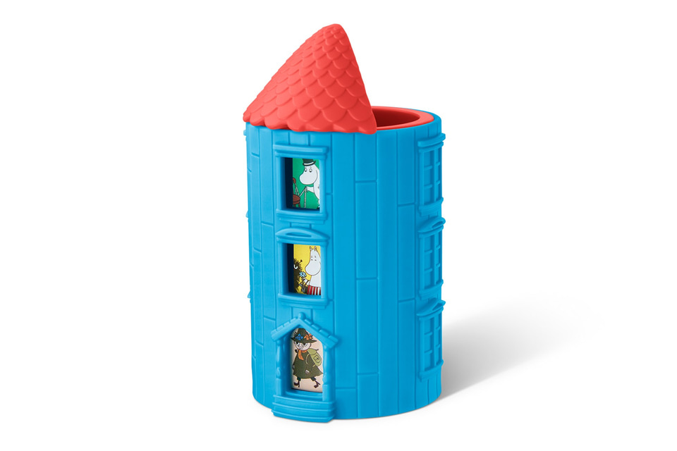 ムーミンやしきをモチーフにした鉛筆立てで、鉛筆やペンを差すことができる。屋根を回転させると、3つの窓から見えるイラストが切り替わり、ムーミンたちの物語を想像して楽しめる。 ※鉛筆やペンは付かない