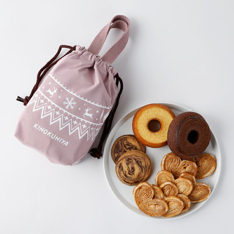 冬らしいデザインを施した巾着タイプのミニバッグで、カラーはミントとピンクを用意。バウムクーヘン、リュネット、アイスボックスクッキーが入ったウインターシーズンの贈り物にもうれしいセット商品になっている。価格は各1652円。