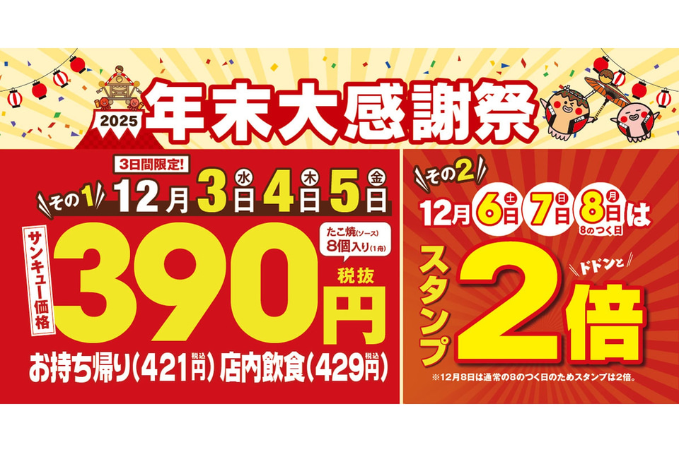 12月3日~5日の3日間は「ぜったいうまい!! たこ焼(ソース、1舟8個入り)」を、感謝を込めた「サンキュー価格」として390円(税別)で提供する。また、12月6日~8日の3日間は、スタンプが貯まるとたこ焼が無料でもらえる「銀だこスタンプカード」のスタンプが2倍になる。