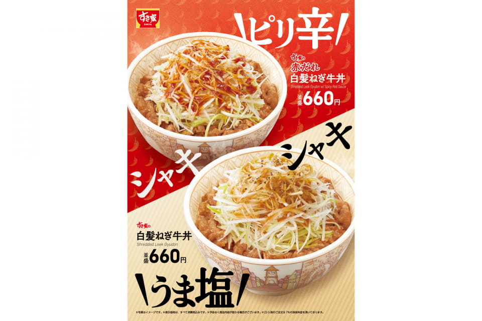 すき家、シャキシャキの白髪ねぎを旨塩だれで楽しむ「白髪ねぎ牛丼」と辛旨だれで楽しむ「赤だれ白髪ねぎ牛丼」発売