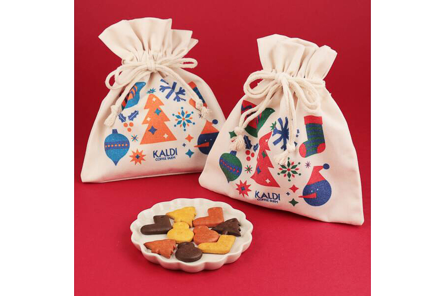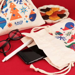 カルディ、コットン素材の巾着にクリスマスをデザインした「サンタさんからのおくりもの」発売