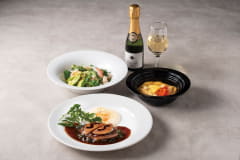 2000年から14年間冬のメニューとして愛された「ロッシーニ風」が、昨年に続き今年も登場する。「牛フィレ肉とグラフォアのロッシーニ風」は、噛むほどにジューシーさと牛本来の澄んだ旨味が広がる、きめ細かく柔らかい赤身の牛フィレ肉に、濃厚な旨味となめらかな口どけの鶏レバー使用の、焼き加減にこだわったグラフォアを重ね、バルサミコソース・トリュフソース・トリュフオイルを合わせて香り豊かに仕上げた。つけ合わせは、フランスの郷土料理「アリゴ」イメージの、芳醇なトリュフソースと相性のよい、まろやかで深みのある卵黄を加えたマッシュポテトとなっている。あわせて前菜メニュー「小柱とオマールソースのグラタン」(温菜)と「蟹とアボカド、香味野菜のサラダ」(冷菜)も販売し、セットでも単品でも注文できる。