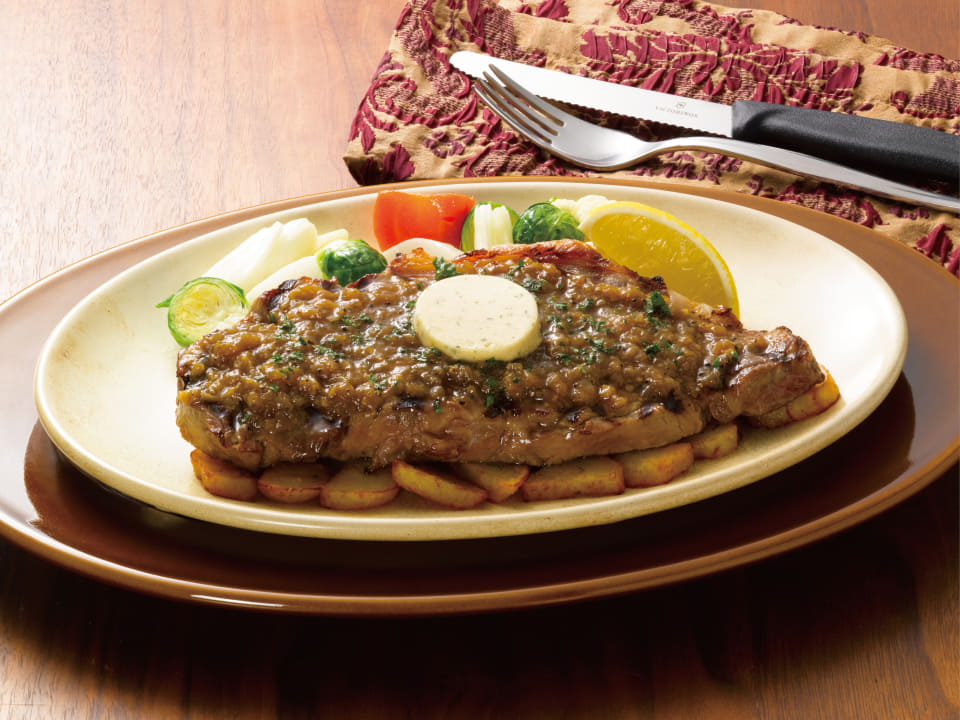 225gの米国産アンガスサーロインステーキに、炒めて甘みを引き出した国産玉ねぎと香ばしい醤油、スパイシーな胡椒を合わせた自社製ペッパーソースをかけて提供する。塩と野菜の水分だけで蒸すことで素材本来の旨みを引き出した冬野菜のエチュベ、ステーキの下に敷いた北海道産のじゃがいもきたあかり、お好みでレモンとともに味わえる。