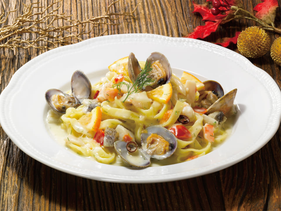 北海道産の真鱈、帆立、あさり、海老を、フェットチーネと絡みのいいクリームベースのソースで仕上げている。具材とソースをフライパンで合わせて調理することで魚介の旨みをソース全体に溶かし、オレンジと合わせることでさっぱりと楽しめる。