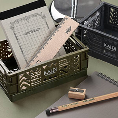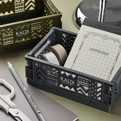 側面にKALDIのロゴをデザインしたミニコンテナはポリプロピレン製で軽く水濡れにも強くスタッキングも可能なため、パウダールームやキッチンなどで小物をすっきりと収納できる。