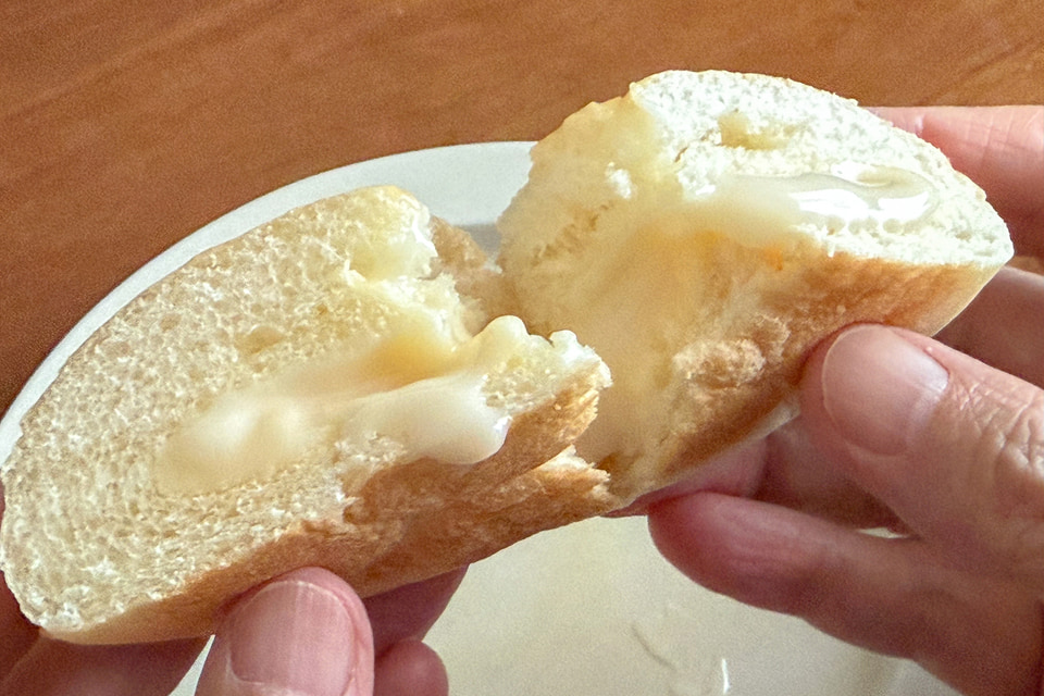 さっそく開けてみると、まず生地がふんわりやわらか! いつもならそのままガブッとかじりつくところですが、撮影のために半分にカットしてみると、なめらかなミルククリームがたっぷり。