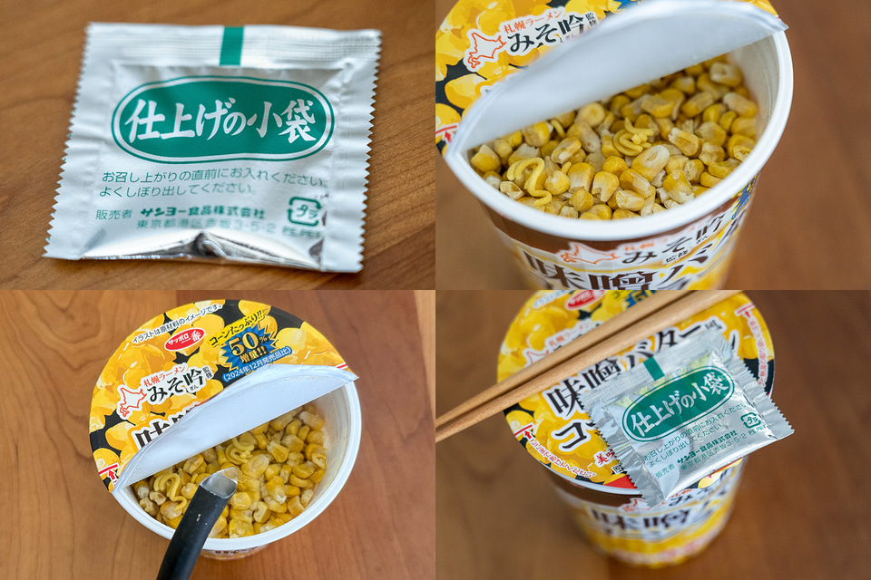 熱湯(必要なお湯の目安量は410mL)を注いで待つこと5分。ちなみに昨年版はお湯を入れてから4分だったようですが、コーンが増えたからか今年は1分長くなりました。