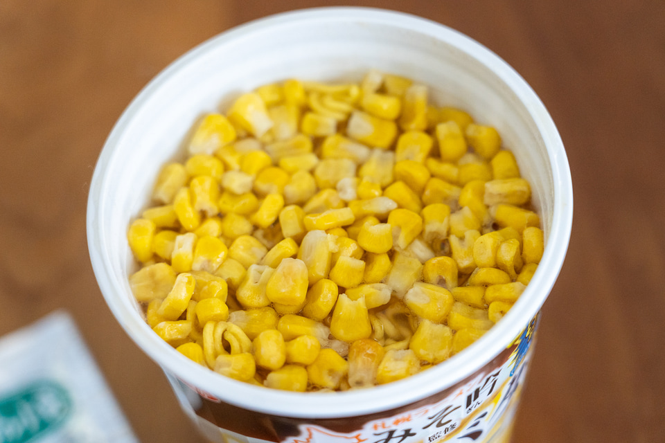 フタを開けてみると、たっぷりのコーン具材にまずびっくり。さすが50%増量バージョン、ほとんど麺が見えませんわ~!