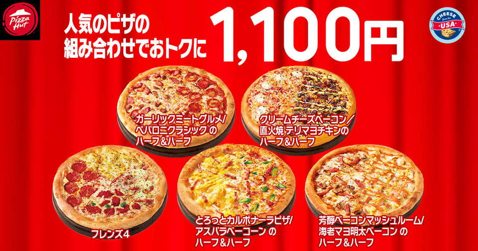 内容: 4種類のハーフ&ハーフピザ(Mサイズ)に加え、定番のフレンズ4が持ち帰り限定で1100円に