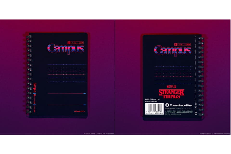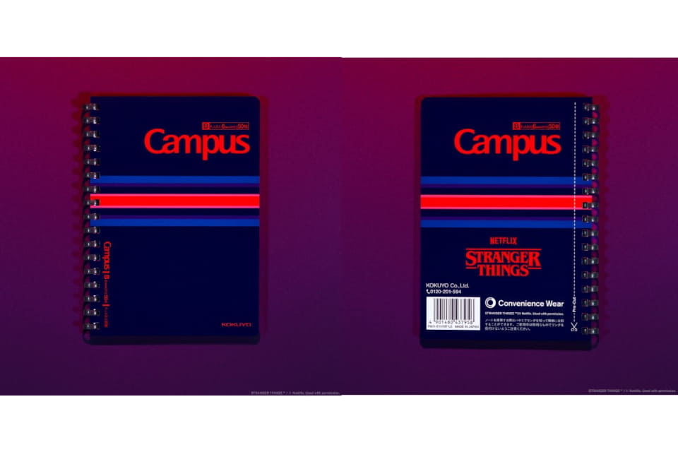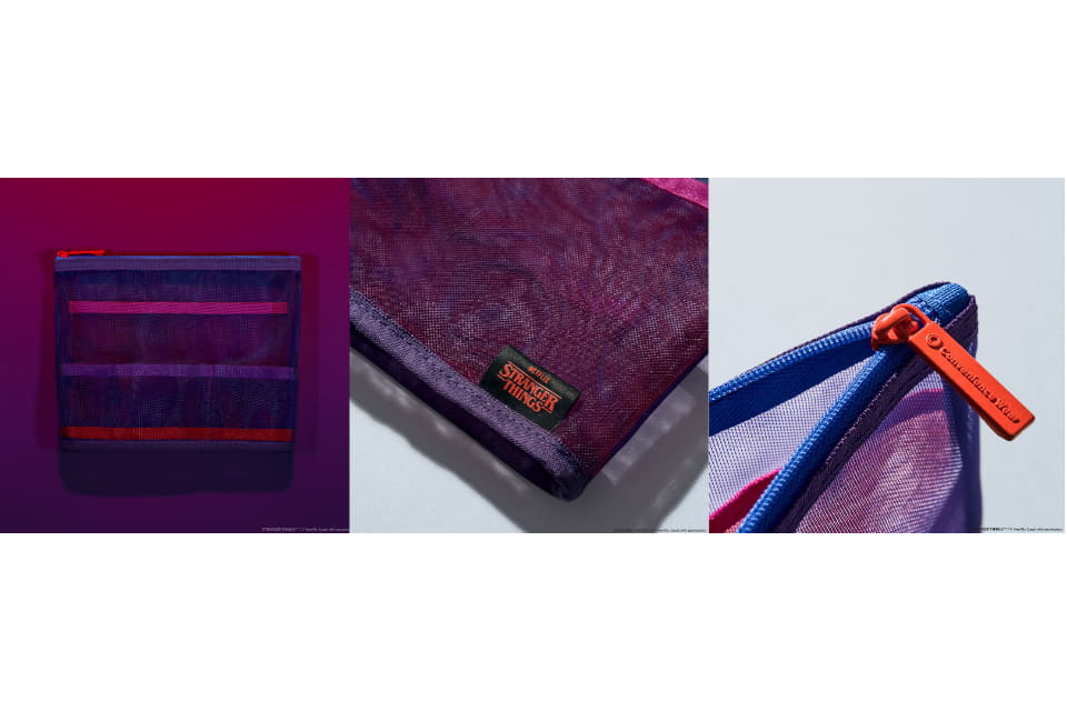 前回のコラボで好評だったという「ラインソックス」「タオルハンカチ」などのアパレルアイテムを復刻するほか、新たにストレンジャー・シングスカラーの「メッシュポーチ」と「リングノート」(2種)を販売。いずれも作品をイメージした配色に加え、タグや表紙にタイトルのロゴ「NETFLIX STRANGER THINGS」取り入れたデザインとなっている。