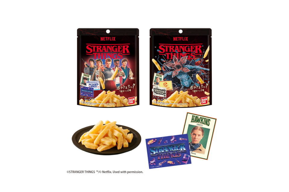 また、12月23日から「Stranger Things ステッカーつきポテトスティック Wチーズ味」を一部店舗で順次先行販売する。なおステッカーは全16種のうちから、ランダムで1枚付属する。価格は213円。