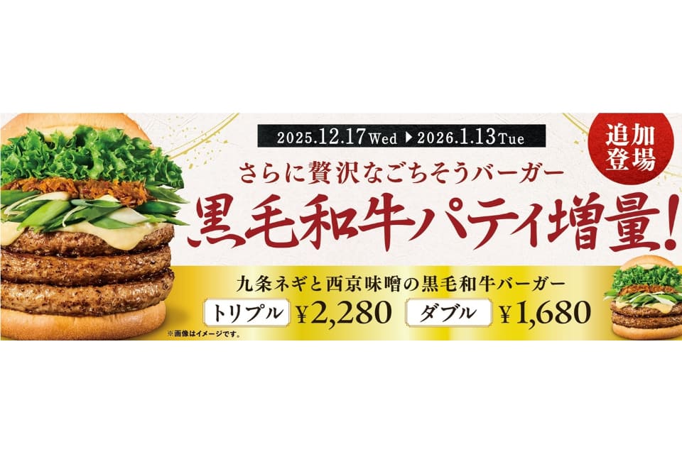 フレッシュネスバーガー(フレッシュネス)は、現在販売中の「九条ネギと西京味噌の黒毛和牛バーガー」において、黒毛和牛パティを増量した「ダブル」と「トリプル」を、12月17日~2026年1月13日の期間限定で販売する。価格はダブルが1680円、トリプルが2280円。