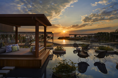 星のや沖縄のプールは、冬でも温かい加温式タイプ。浅瀬のエリアもあるプールサイドでは、お茶やスイーツを楽しむだけでなく、時折プールに入ってリラックスすることもできる。海に溶け込むように広がるインフィニティプールと絶好のロケーションにあるソファーやビーチベッドでくつろぎながら南国らしさを楽しめる。