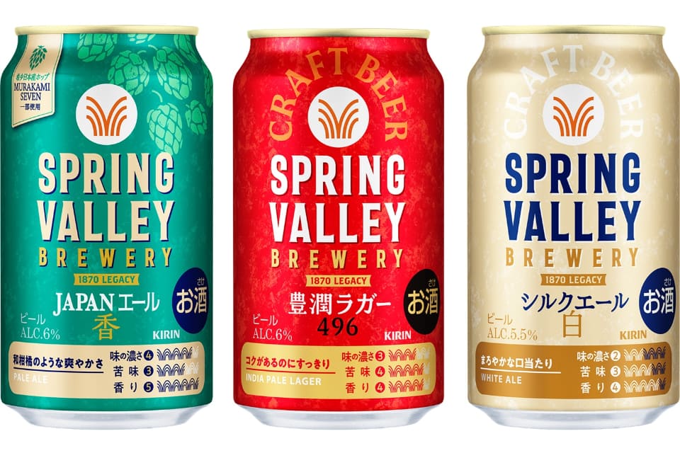 「SPRING VALLEY BREWERY JAPANエール 香」は中味・パッケージともに12月中旬製造品より順次リニューアル、「SPRING VALLEY BREWERY 豊潤ラガー 496」と「SPRING VALLEY BREWERY シルクエール 白」も同時期よりパッケージを順次リニューアル。また、会員制生ビールサービス「キリン ホームタップ」と直営店の「スプリングバレーブルワリー東京・京都」では、2026年2月製造品より順次切り替えを行なう。