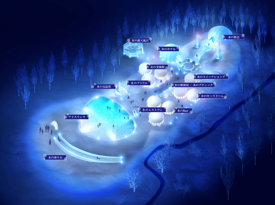 1998年から続く期間限定のこの街では、3.2haの敷地に11棟の氷や雪でできたドームが立ち並び、寒さを楽しむさまざまな体験や幻想的な氷の世界を体感できる。極寒グルメが楽しめる「氷のレストラン」「氷のスイーツショップ」が新たに登場し、子供たちに遊び場を提供する「氷のキッズドーム」も用意された。また、象徴的な存在である「氷の教会」は今年20周年を迎え、デザインをリニューアル。加えて、氷の教会の物語をより深く体験できる「氷の美術館」も登場した。