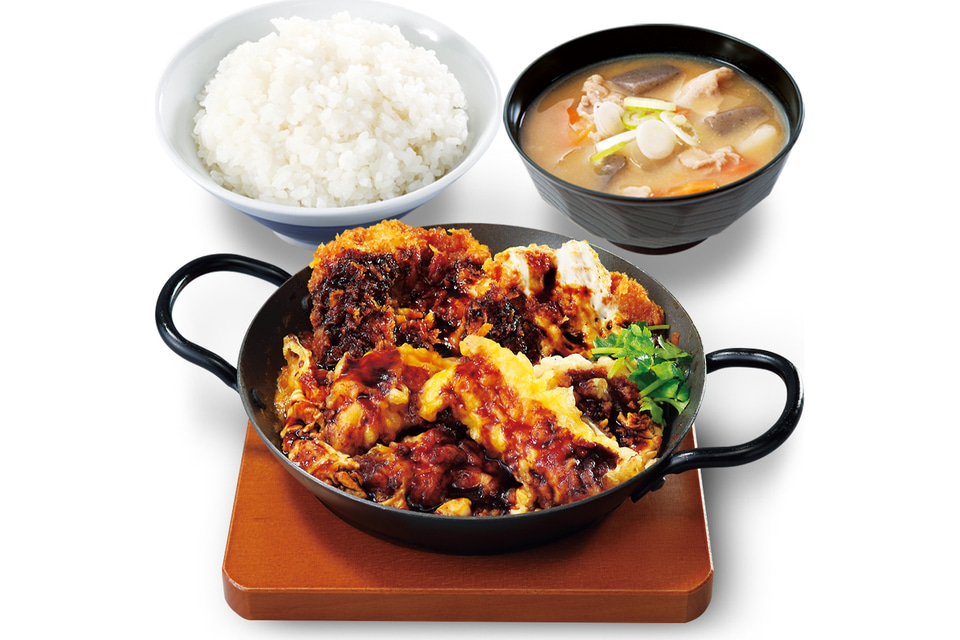 かつやこだわりの豚ロースを天ぷら仕立てにし、豚ロース天と食べ応えのあるチキンカツ2枚を玉子でとじ、丼へ豪快に合い盛りにした。コク深く甘味のある特製「黒味噌ダレ」をたっぷりとかけており、ジューシーな肉の旨みと絡みあい、思わずご飯をかきこみたくなる味わいとなっている。