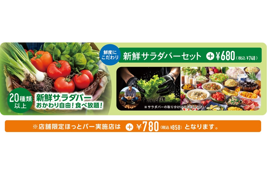 さらに、単体のおつまみメニュー以外にも、リブロースステーキや黒毛アンガスロースカットステーキと合わせたコンビメニューも展開。選べるセットメニューを付ければ、20種以上の野菜が食べ放題の新鮮サラダバーも同時に楽しめる。