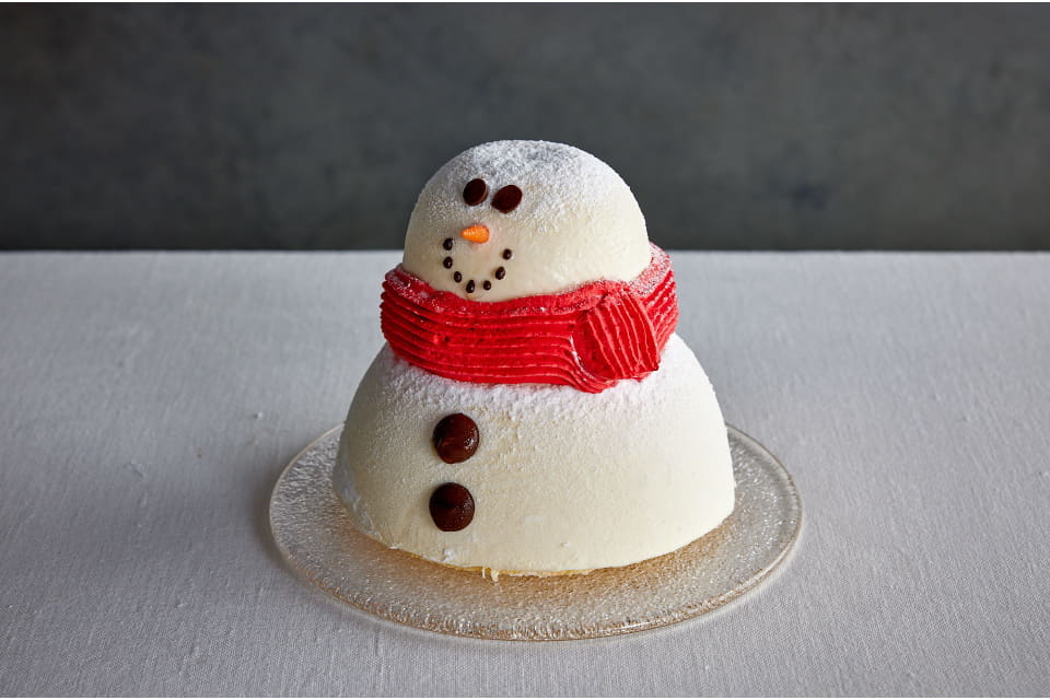 赤いマフラーを巻いたスノーマン(雪だるま)型のケーキ。ホワイトチョコレートムースのボディーの下に、甘酸っぱいラズベリームースとミックスベリージャムを詰めた。やわらかく軽やかな食感で、子供にもオススメとしている。