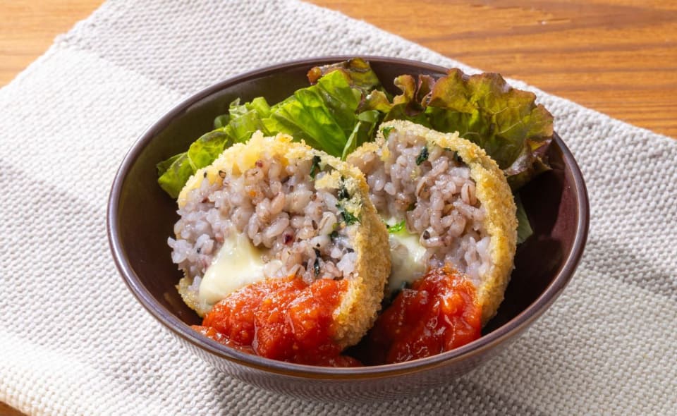 五穀ご飯とほうれん草、まろやかなチーズを包んだライスコロッケで、さっぱりとしたトマトソースを添え、食感と素材の風味を楽しめる。定食やポトフのお供におすすめだという。