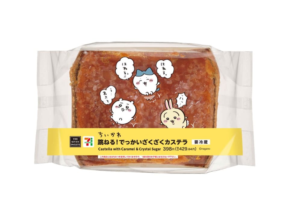 ちいかわたちが飛び跳ねていたザラメ付きカステライメージの商品で、ザラメのざくざく食感としっとりとした生地のコントラストを楽しめる。