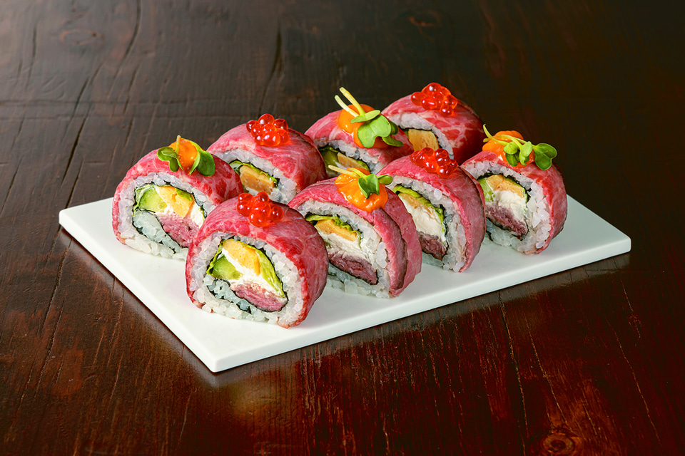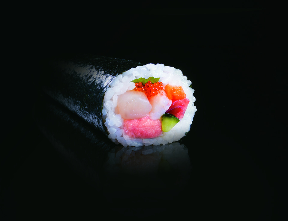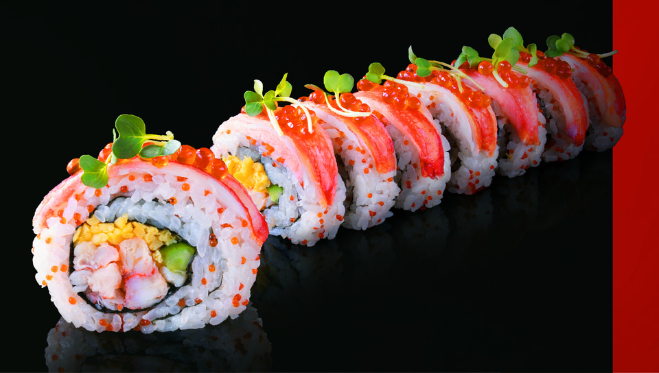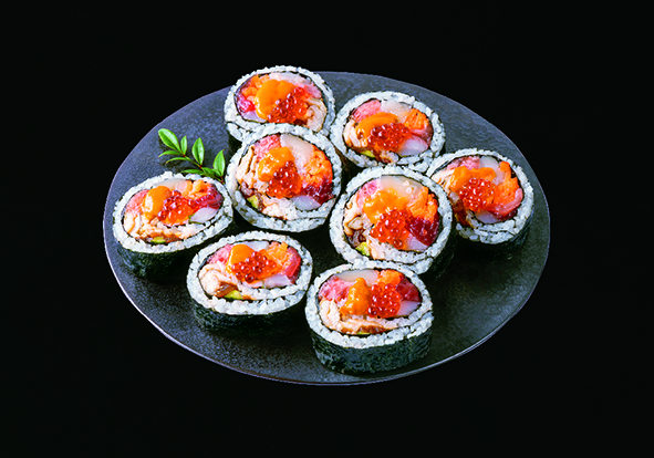 見た目も華やかに、たらば蟹とずわい蟹の2種が楽しめるご馳走巻。いくらの甘さととびっ子の食感がアクセントになっているという。