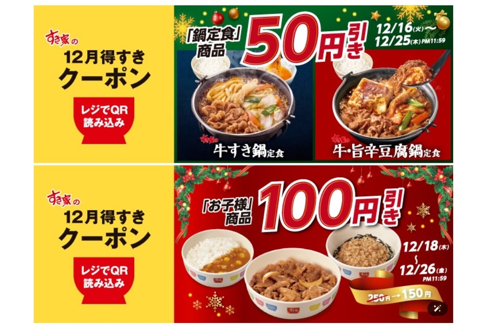すき家は公式アプリで「12月得すきクーポン」第3弾の配信を開始した。「牛すき鍋定食」「牛・旨辛豆腐鍋定食」が50円引き、お子様商品を100円引きで楽しめるクーポンとなっている。