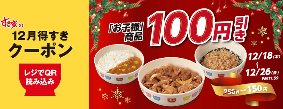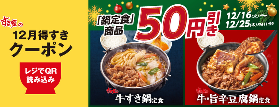 すき家「12月得すきクーポン」第3弾を配信! 鍋定食が50円引き・お子様商品は100円引きに